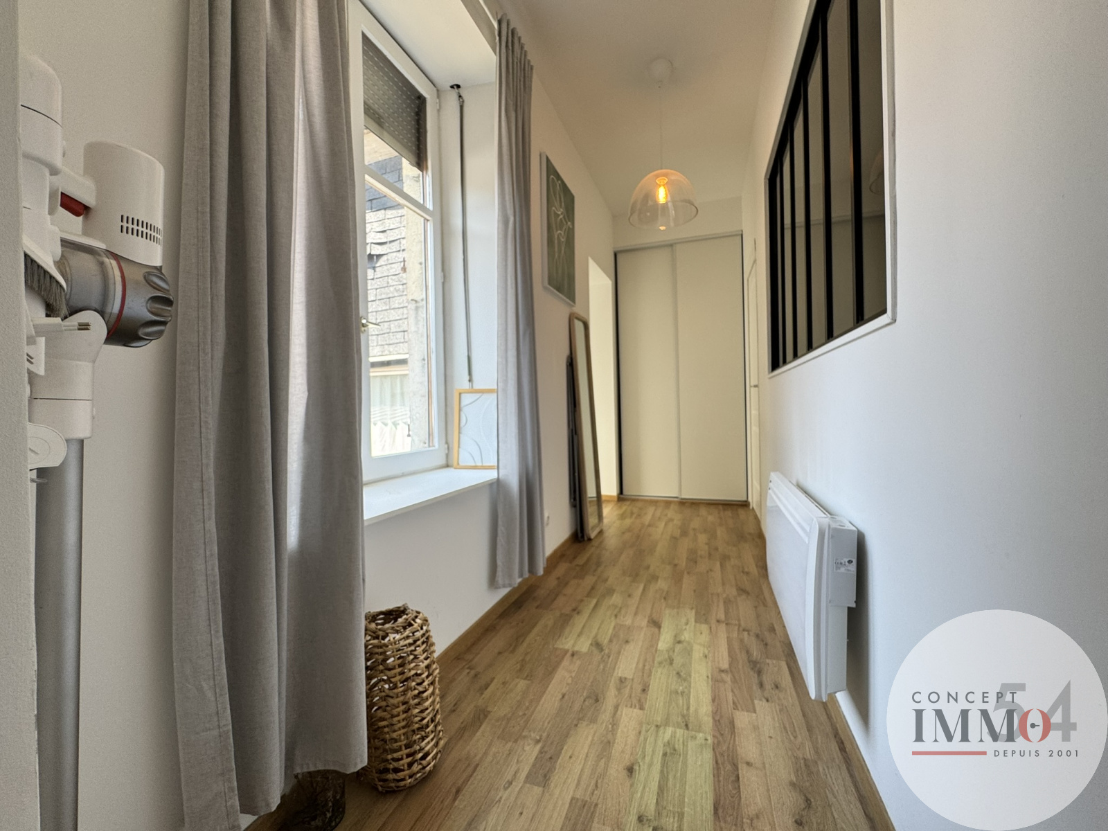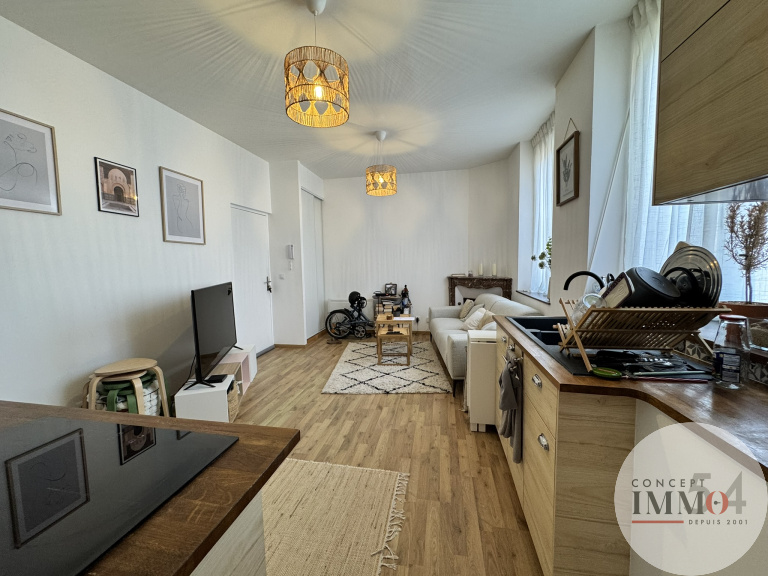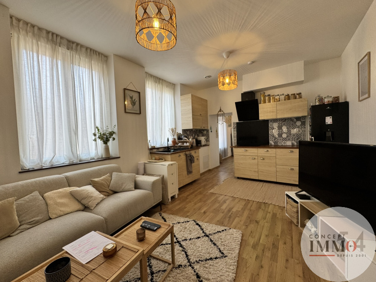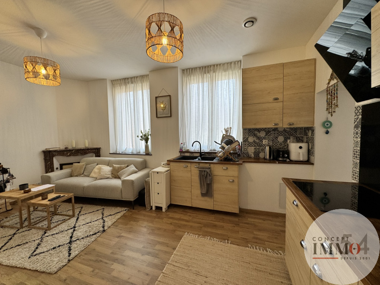 Place du Marché - Bel appartement T3 de 55.68m², situé au 1er étage d'un immeuble calme, comrpenant : cuisine équipée (plaque de cuisson et hotte) ouverte sur séjour, deux chambres dont une avec placard, une salle de douche, et un WC séparé. Chauffage individuel électrique.