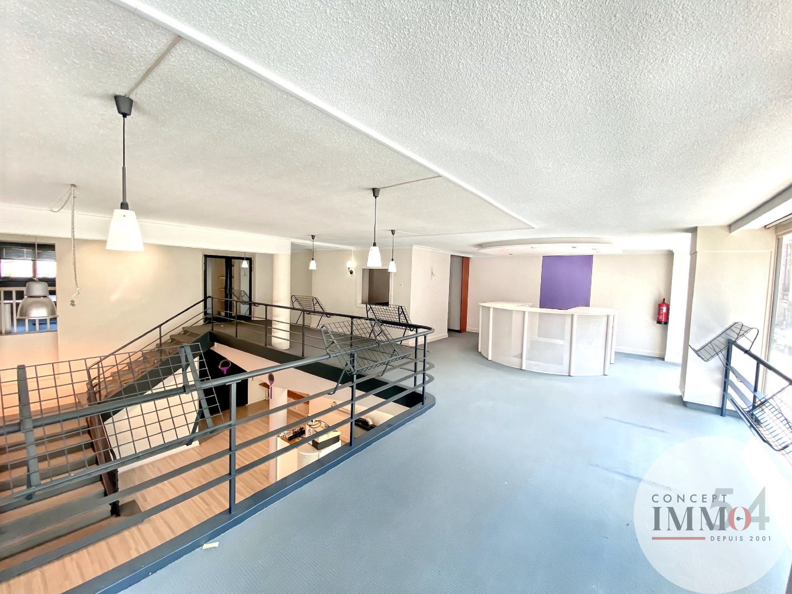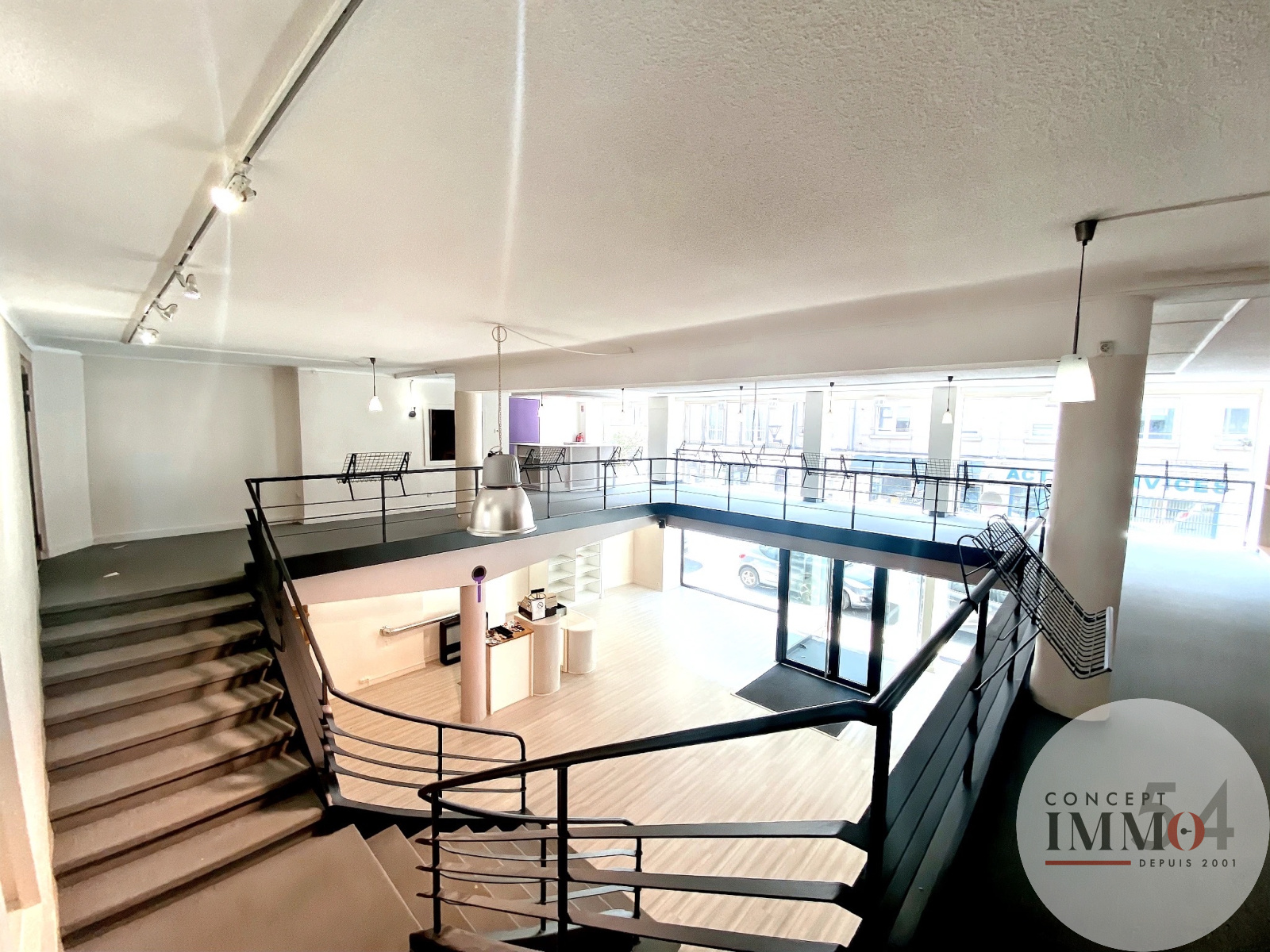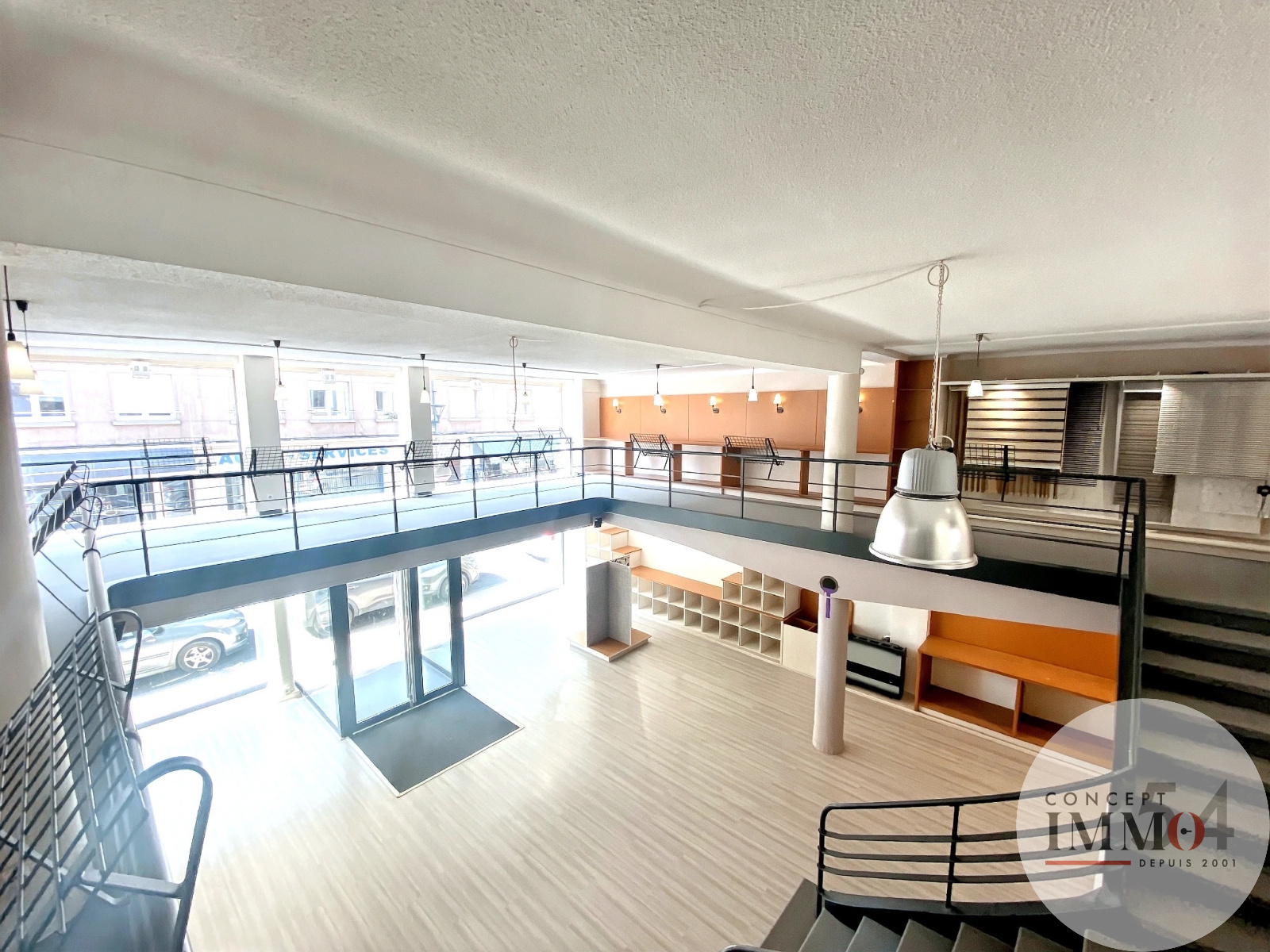 Hall de vente en duplex – 107 m² en rez-de-chaussée + 86,05 m² en mezzanine :