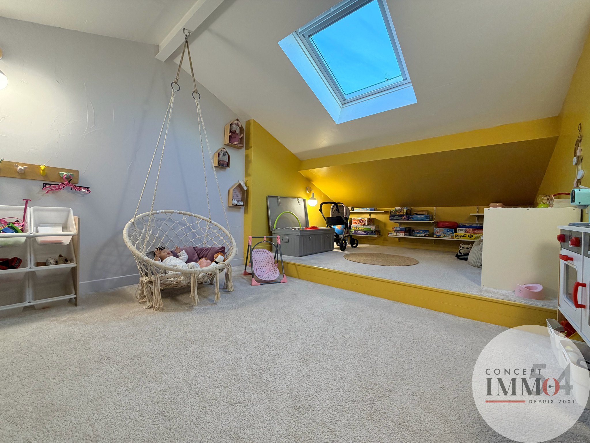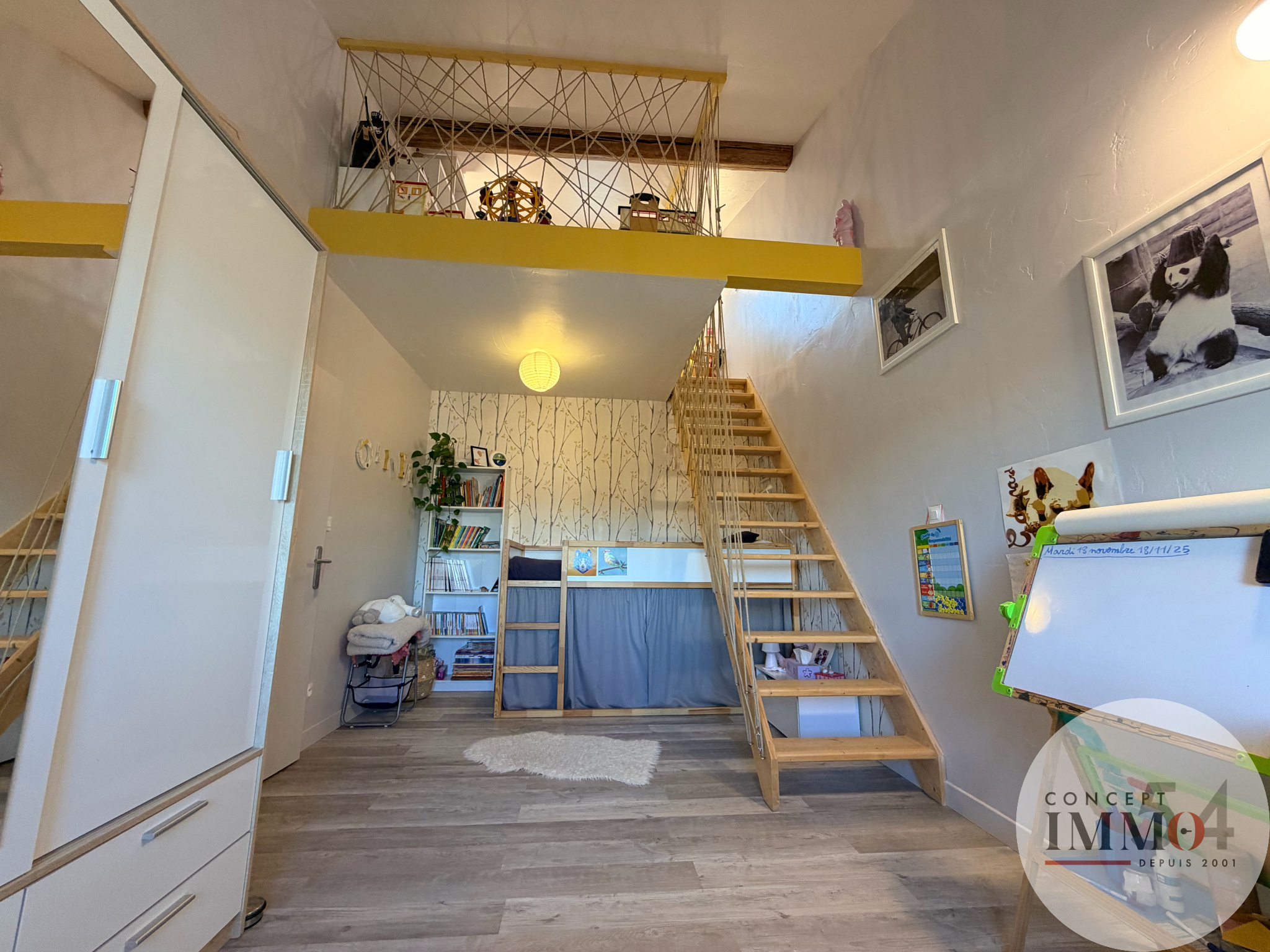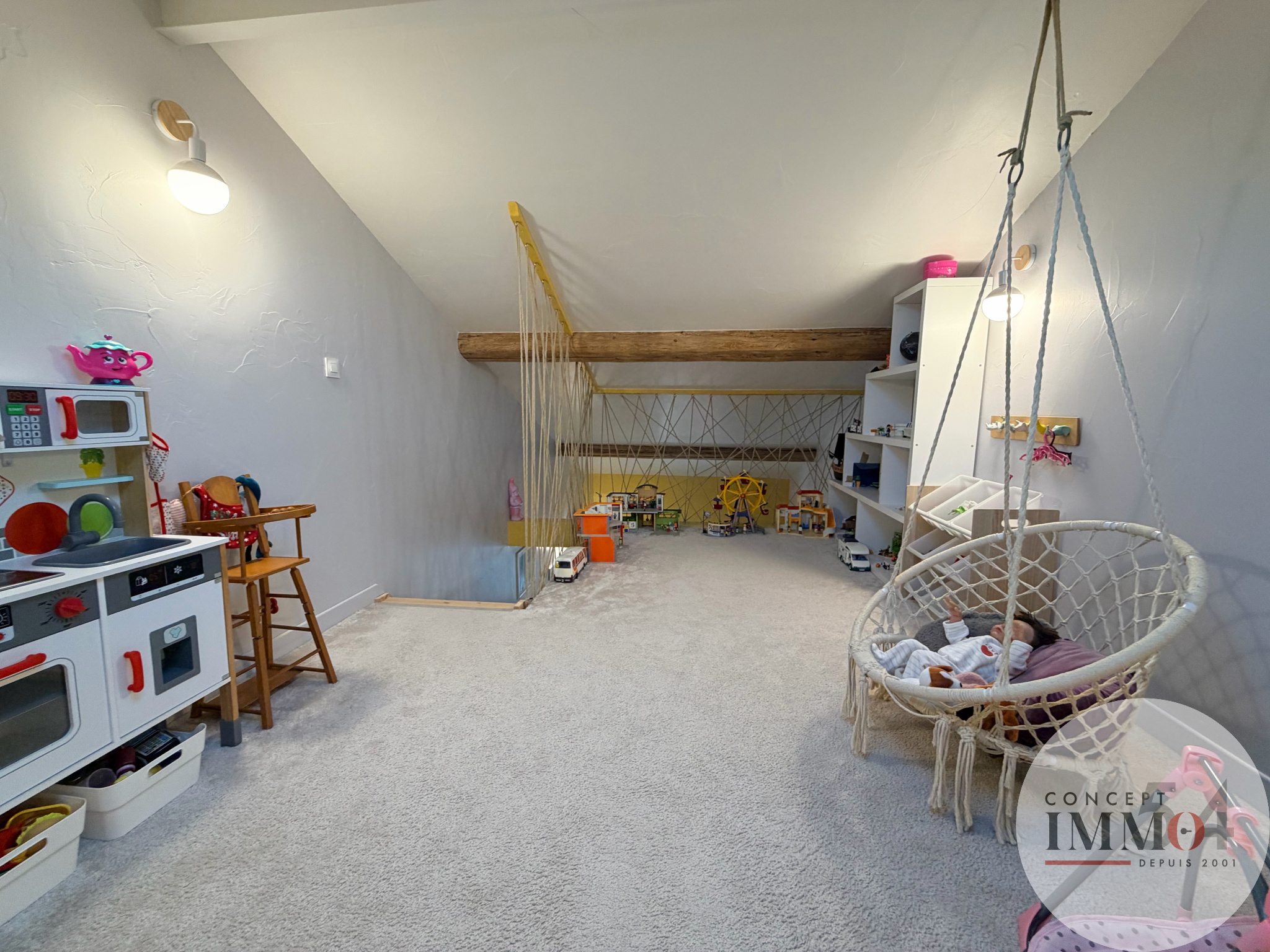À l’étage, un dégagement mène à 4 belles chambres, dont 3 disposent de placards intégrés. La 4ème bénéficie d’une grande mezzanine, offrant un espace supplémentaire idéal pour un bureau ou une salle de jeux. Un grenier est également accessible au second niveau.