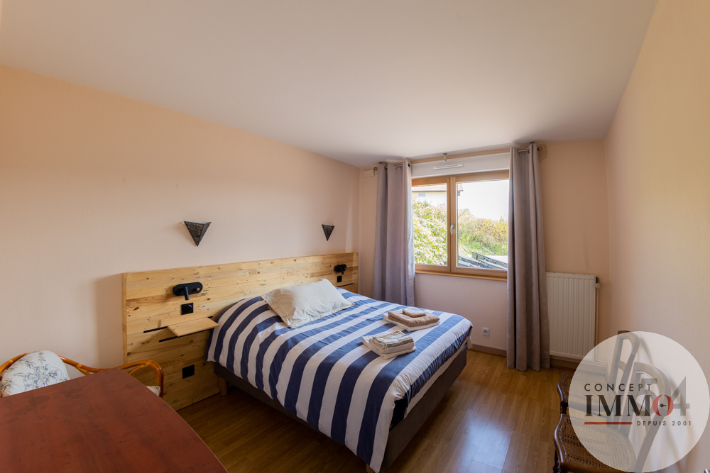 En Rez de Jardin: Un appartement T3 indépendant + entrée, cuisine équipée, salon séjour, deux chambres, une salle de jeu, deux WC, buanderie, cave, chaufferie, deux garages, terrasse privative.